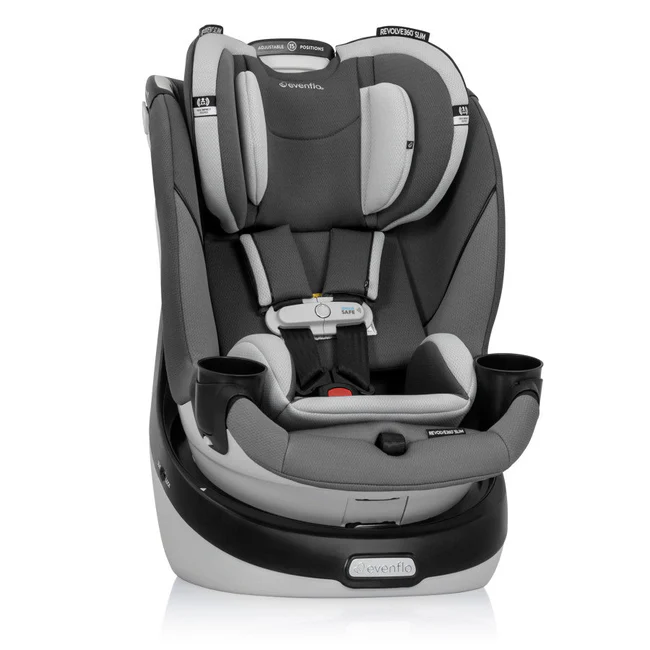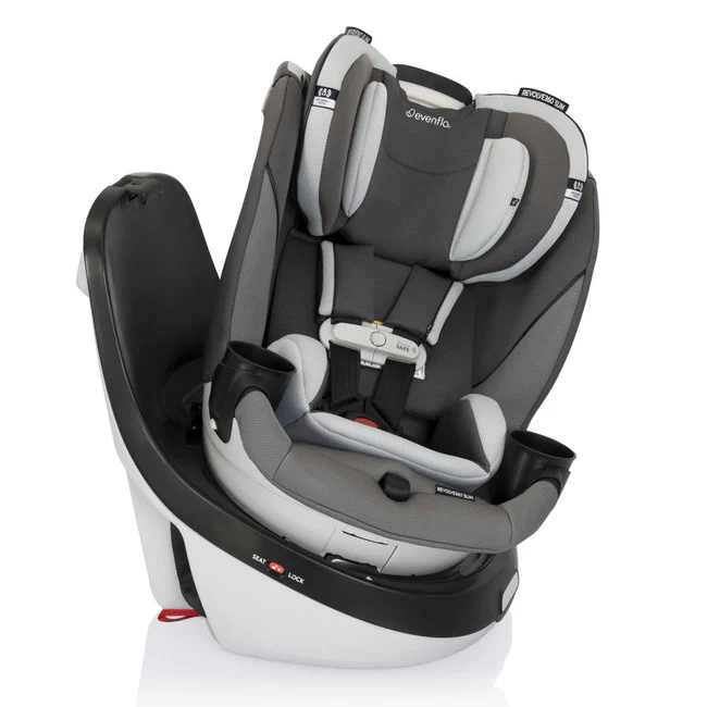 Got a compact vehicle and a little one on the way? Check out the Evenflo® Gold Revolve360™ Slim 2-in-1 Rotational Car Seat with SensorSafe™! We slimmed the exterior of our revolutionary car seat to create a 16.7 in. footprint without sacrificing your child’s seating space or safety. You can fit more of what you love into your backseat with more room for passengers and your growing family! A spin-off of the Revolve360, America’s bestselling rotational car seat, the Revolve360 Slim offers one-hand, 360° rotation in all modes, making it easier to get your child in and out of the car. But 360° rotating is just the beginning. The Revolve360 Slim offers two modes: rear-facing (4 lb to 50 lb, for a child measuring from 17 in. to 48 in) and forward-facing (22 lb to 65 lb, for a child measuring 28 in. to 49 in.). For peace of mind all the way around, this slim fit car seat offers the extended security of rear-facing all the way up to 50 lb. Child safety experts say the longer your child remains rear-facing, the better. Convenience comes full circle in a rotating car seat you can install just once for rear-facing and forward-facing, with no need to uninstall your car seat in order to make the switch. You’re looking for a safe convertible car seat — and the smart car seat choice is a connected car seat. With SensorSafe to connect you to your little one from the backseat, the Evenflo Gold Revolve360 Slim is clearly the gold standard when it comes to safety. While your eyes are focused on the road, integrated SensorSafe technology alerts you in real-time to four potentially unsafe conditions from your child’s slim fit car seat via your phone: unexpected chest clip unbuckling, temperature too hot or too cold in the car, child unattended in the car, and child seated too long. Sure360™ Safety Installation System with LockStrong™ and Tether360™, plus a handy bead-level indicator for leveling in seconds, make one-time installation safe, secure and simple. The best swivel car seat is one that’s easy to live with! On-the-go recline means you can adjust the car seat to the ideal angle without having to reinstall the car seat or bother your child. Offering good looks and ease at every turn, the Evenflo Gold Revolve360 Slim features our most sophisticated fabrics and elevated touches to complement your bold moves in style. Discover the new spin on Slim! At Evenflo, we go above and beyond government standards to create car seats that are safe. The Evenflo Gold Revolve360 Slim meets or exceeds all applicable federal safety standards. It is structural integrity tested at energy levels approximately 2x the federal crash test standard, and it is side-impact tested, rollover tested and temperature tested. If you need help installing your car seat, our ParentLink® customer service experts offer help online in real time. Get live video support with a certified car seat safety technician to assist with proper vehicle installation, so you can drive with confidence. It’s been 100 years and Evenflo continues to push the boundaries in baby and children’s gear design and innovation. We meet the needs of new generations of parents by focusing on what they really care about: leading-edge safety, smart design and technology, and convenient features that help them enjoy the journey of parenthood